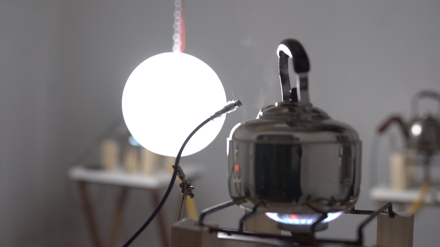 Unas teteras de uso doméstico en ebullición, son el medio que hace audible el estado gaseoso del agua. Simultáneamente, una bola de hielo suspendida derrama gotas a causa de su natural y paulatino derretimiento. Estos estados del agua son amplificados e intervenidos por tecnologías y efectos que permiten esculpir y manipular el sonido en el espacio a modo de composición sonora/musical en tiempo real.