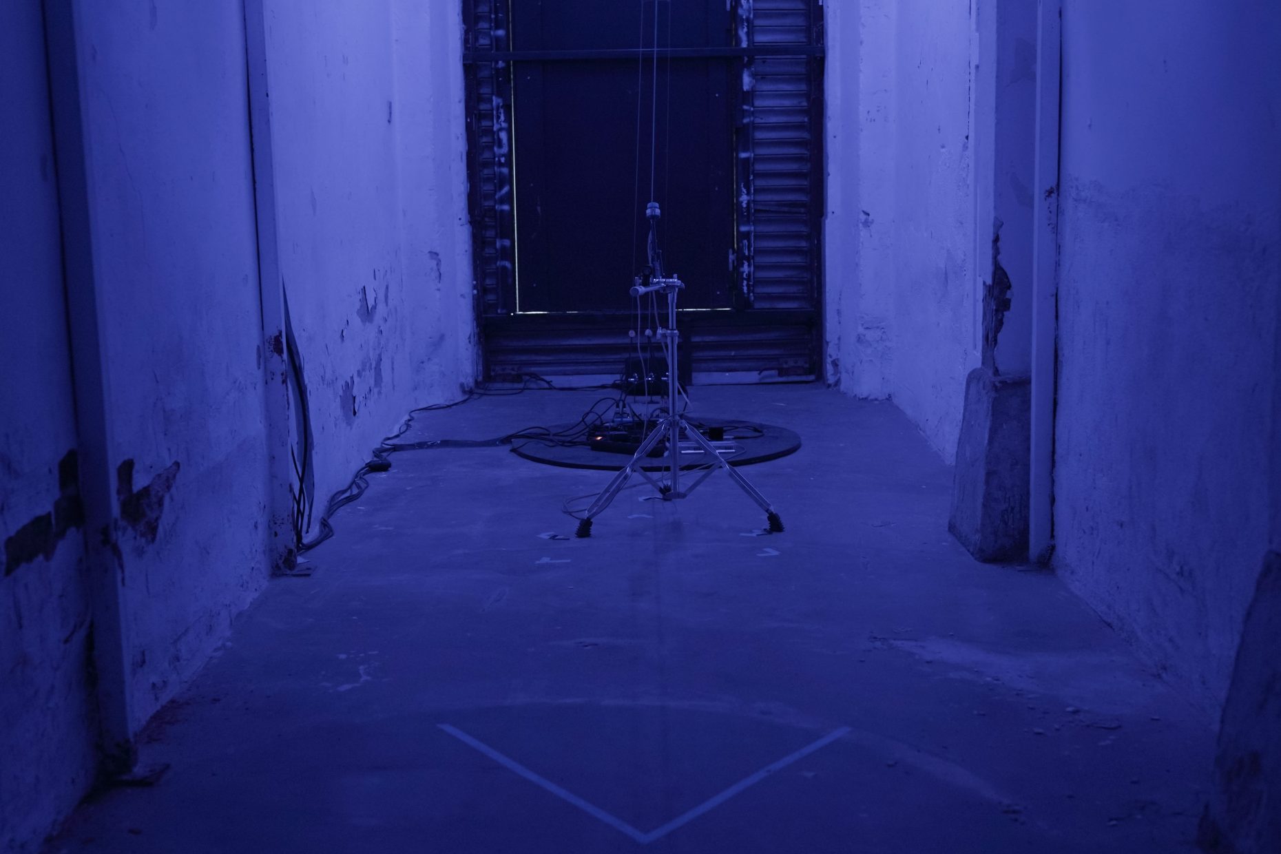 La instalación atraviesa y tensa el espacio arquitectónico mediante tres cables de acero que irrumpen desde la esquina superior hasta la esquina inferior opuesta. Las tensiones, dispuestas en paralelo, se unen en el centro mediante una sutil pieza que las pone en relación y, por tanto, en continua afección. La sonoridad de la instalación está mediada por la afinación de las cuerdas -mediante clavijas de afinación de bajos- y el movimiento de un transductor dispuesto en un mecanismo automatizado que, al tensar las cuerdas, induce un ciclo recursivo que produce vibraciones llanando el espacio con una sonoridad retumbante, sobrecogedora y rítmica. La tenue iluminación azul, que dificulta la visión, acentúa la sensación de escucha priorizándola y realzándola enfáticamente.